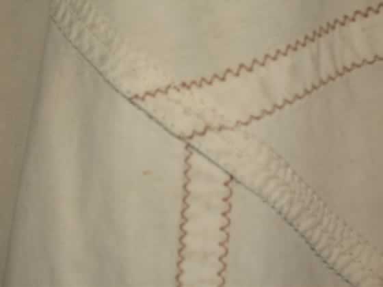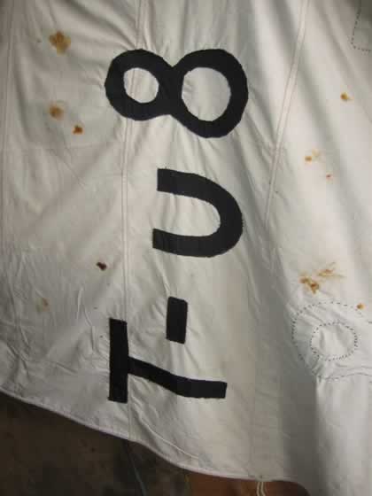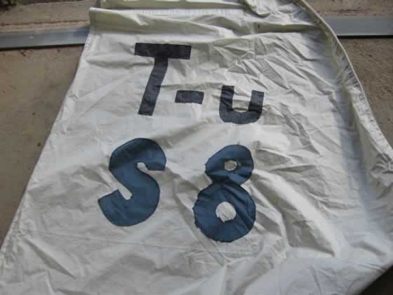 Jag köpte allt som finns kvar efter T-u 8, dvs alla segel (både bomull o dacron) , mast, bom, skot, fall, köl och div inredning i mahogny. Det enda som saknas är skrovet./Anders Wiss ![]() Dacronsegel. Under S 8 finns det spår efter 10. Seglet har alltså varit storsegel till T-u 10 en gång i tiden. ![]() Storseglet är lagat. ![]() Bindrev på bomulls-seglet ![]() Bomulls-segel. ![]() Sömmar i bomulls-seglet. |